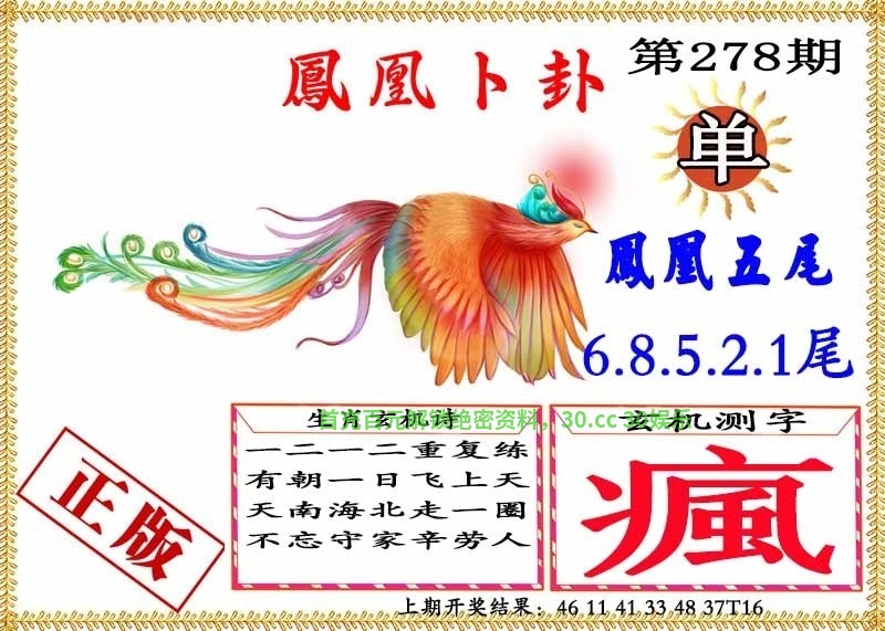282期:玄机测字【夏】开:發00 拆字:11划单数 抓码:11.23.13.25.24.36.21.33.16.28 夏,11羊单数 玄机七肖:羊蛇马鸡虎龙猴 玄机五肖:羊蛇马鸡虎 玄机三肖:羊蛇马 玄机一肖:羊 卜卦单双:单数 卜卦五尾:1.3.0.7.6 |